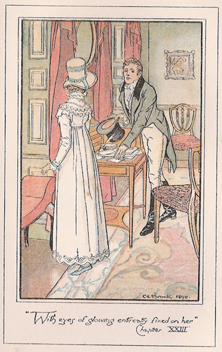 Anne and Wentworth are both in a room at the White Hart Inn in Bath. He is sitting at a desk writing a letter. She is nearby speaking to a mutual friend, Captain Harville, about men, women and constancy. Harville believes that men feel more deeply than women. Anne takes the opposite view, and while she does not mention Wentworth or her own circumstances, everything she says is clearly with him in mind.