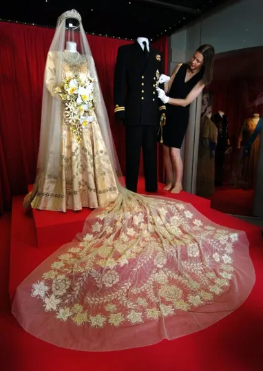 The bride selected court dressmaker Norman Hartnell for the design duties, as she would continue to do for decades to come. Hartnell's inspiration for the gown was Botticelli's Primavera (above left), which symbolizes the coming of Spring - certainly a metaphor for England's rebirth after the war. The result (his sketch, above right) was a rather intricate and dreamy creation in ivory duchesse satin that was both extravagant and yet somehow fitting for the austere times. Just like everyone else in the country, Princess Elizabeth had to fund her gown with clothing ration coupons. Unlike everyone else, she was allowed 200 extra coupons by the government. Famously, people sent in their own coupons to help the Princess out (these were sent back with a note of thanks, since it was illegal for her to use them). In another sign of the times, the public had to be reassured that the silkworms used to create the gown came from China, rather than enemy countries such as Italy and Japan. (Read more.)